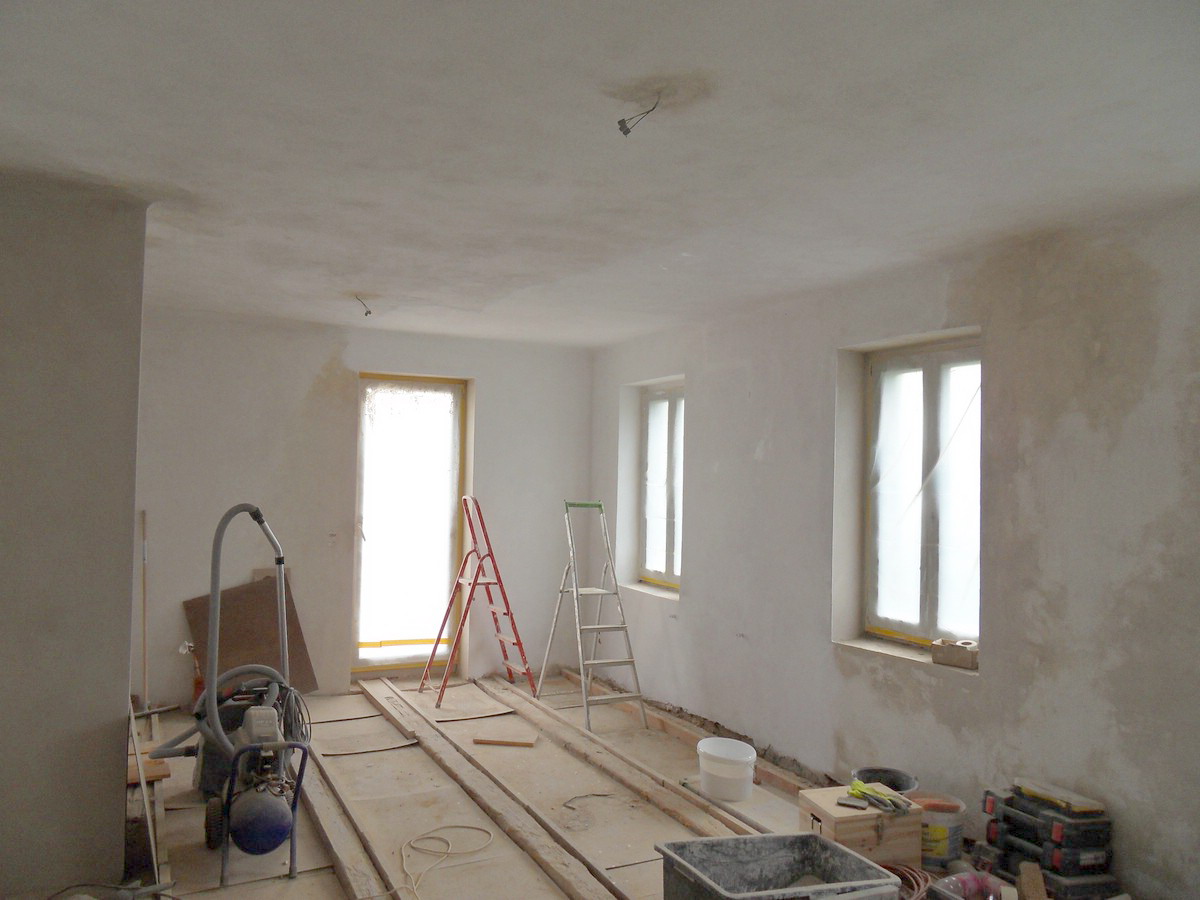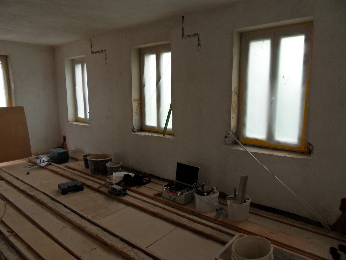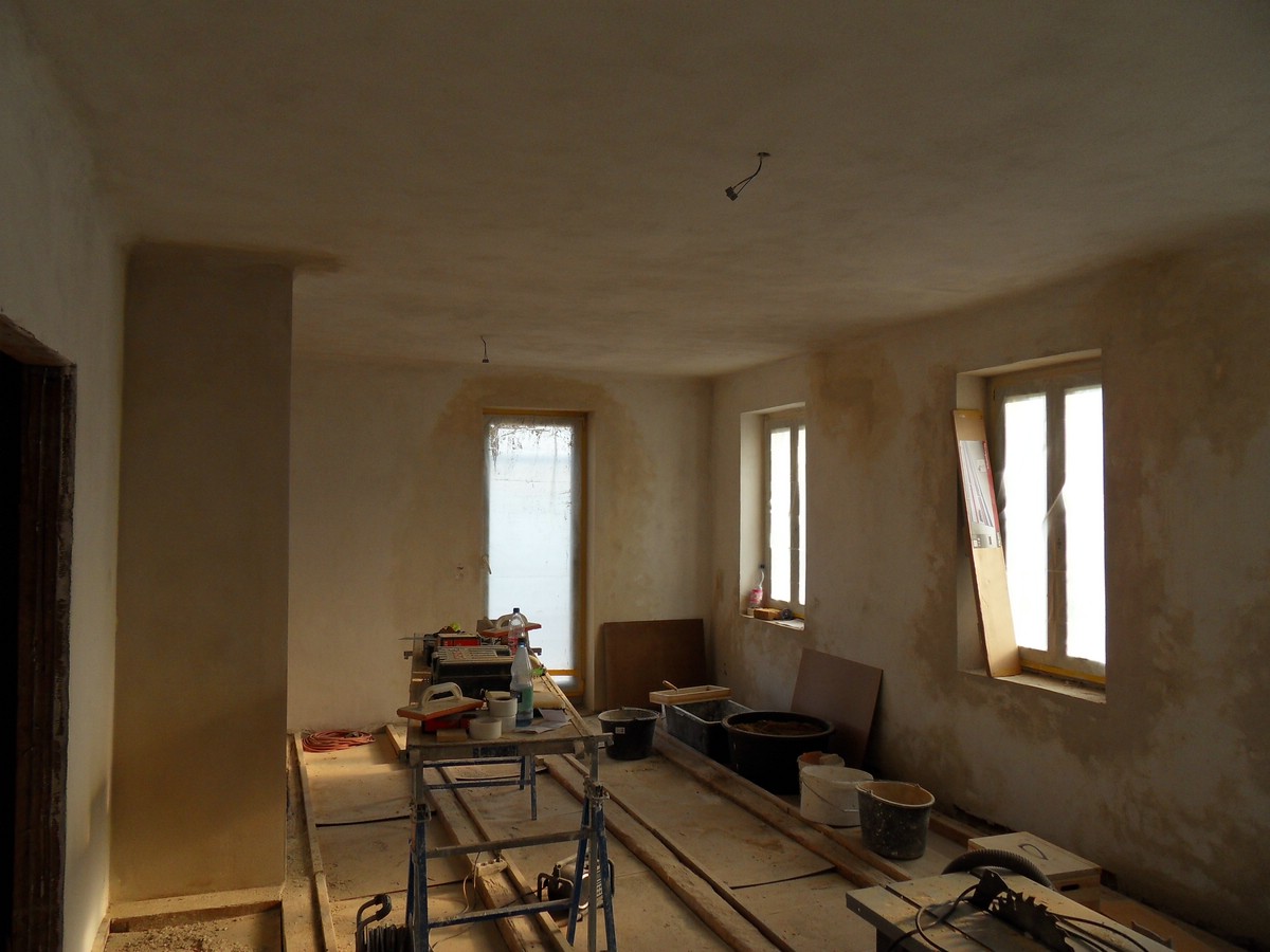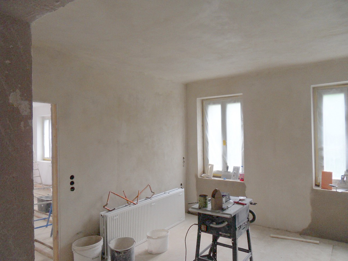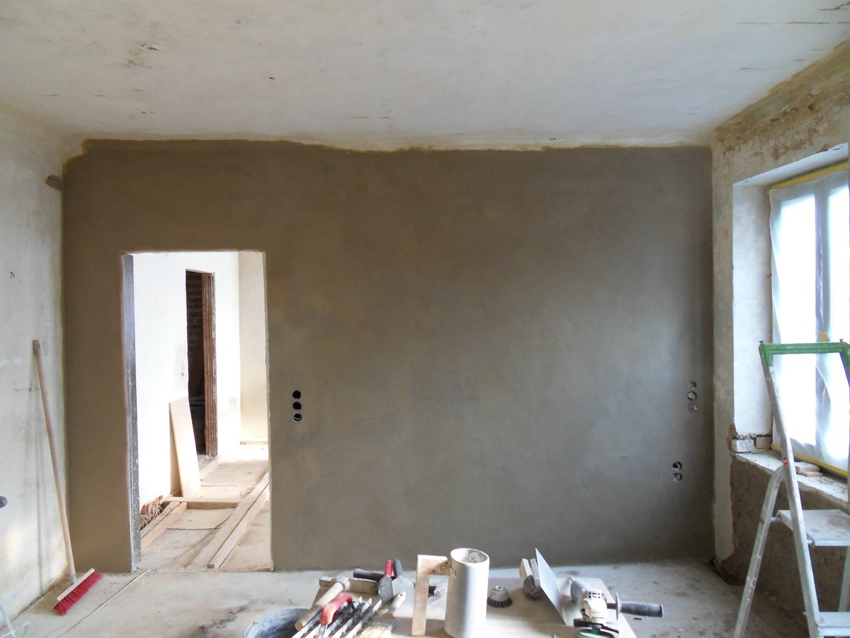 Ramon hat das Bad weiter vom Putz befreit, Ich hab mich wieder Kalkfarbe gewidmet und die Stube weiter gekalkt. Auch unser Maurer war nicht untätig. Im Flur ist der erste frische Putz dran.