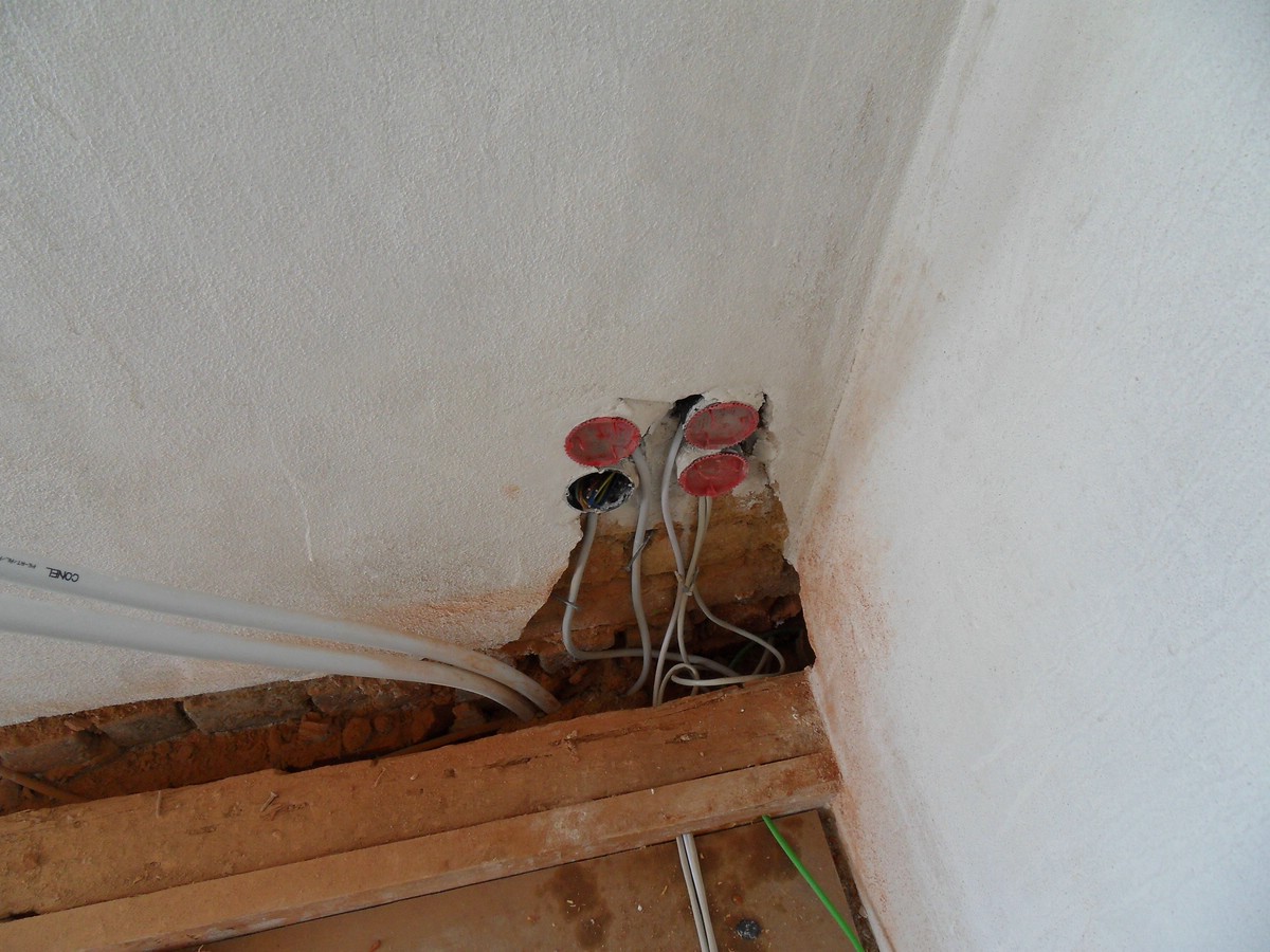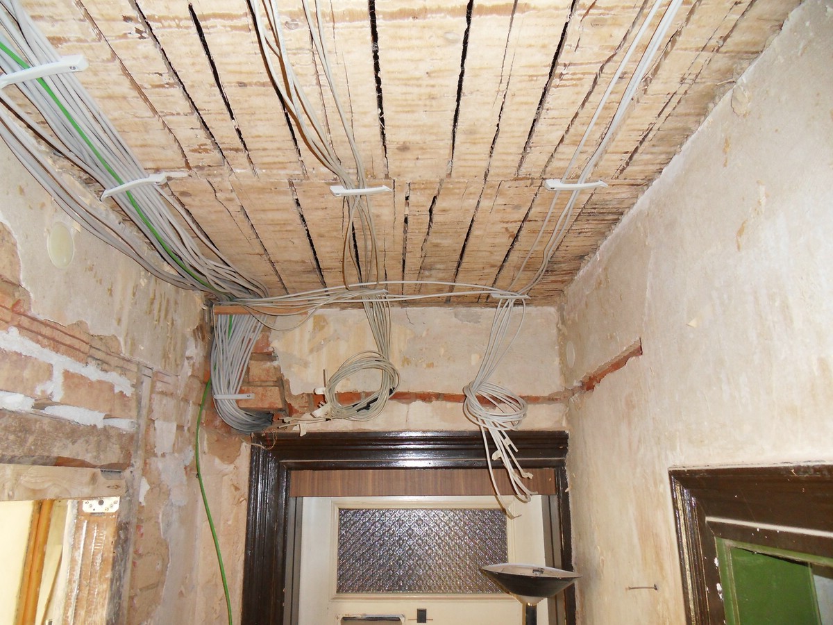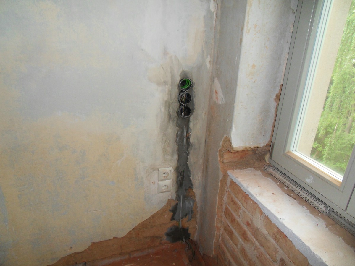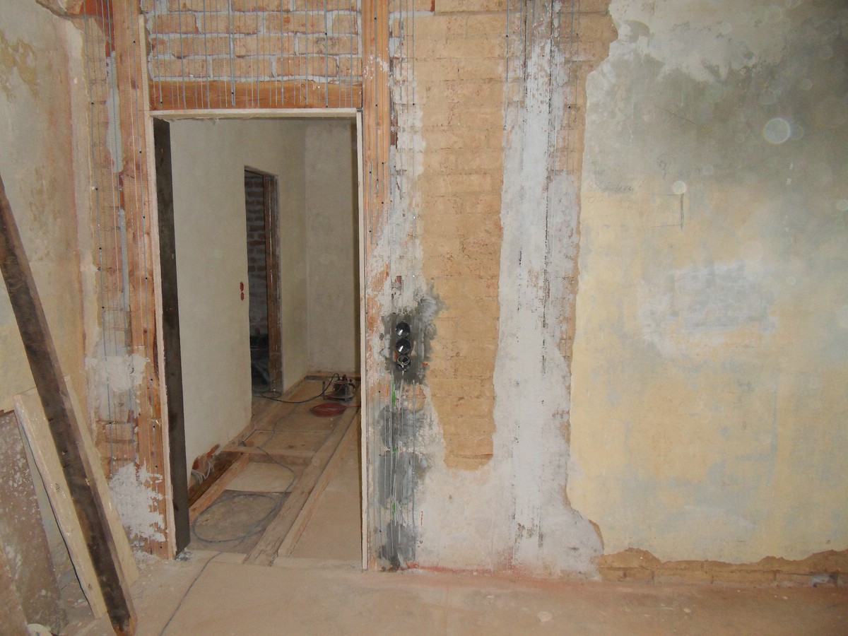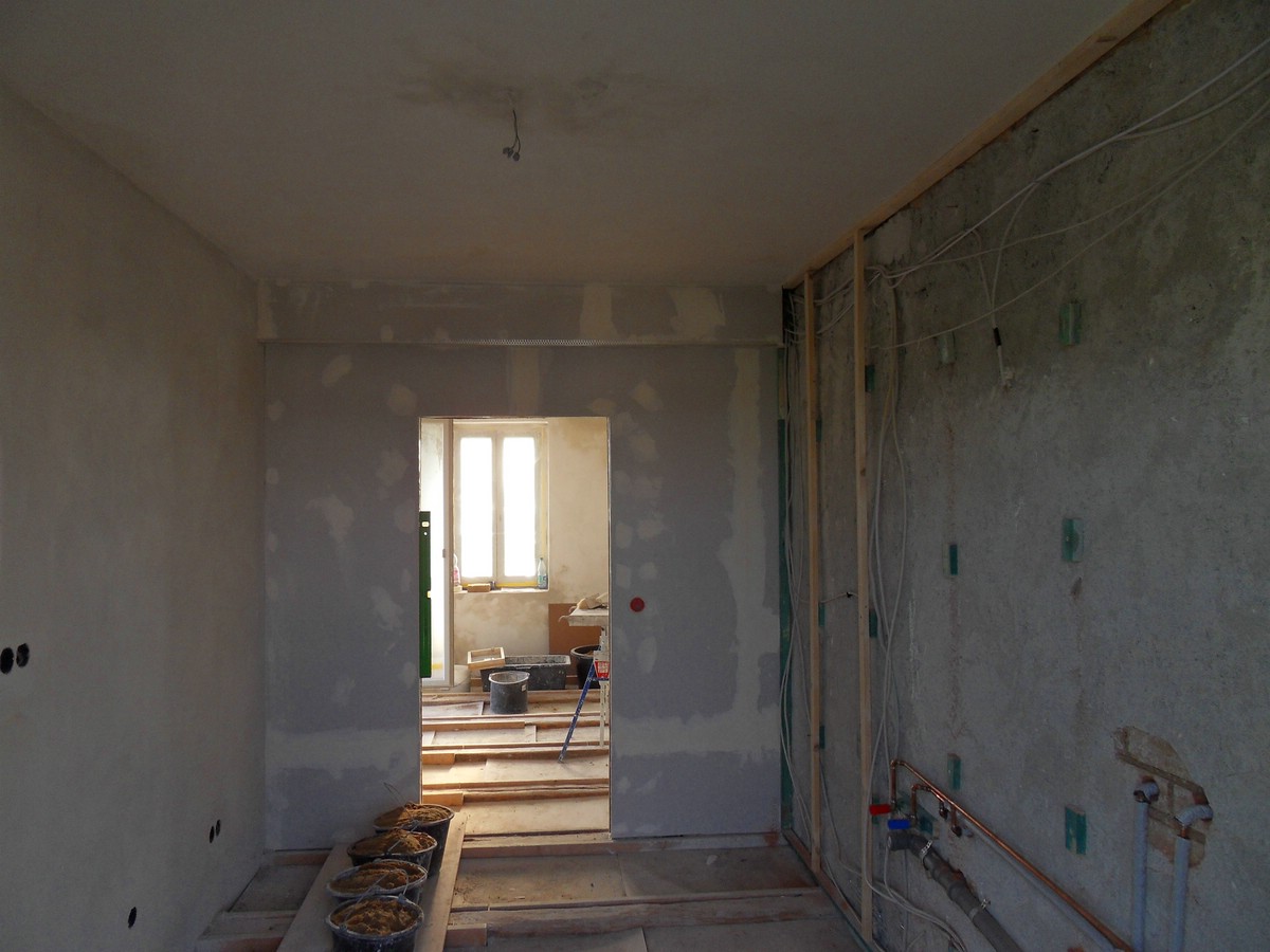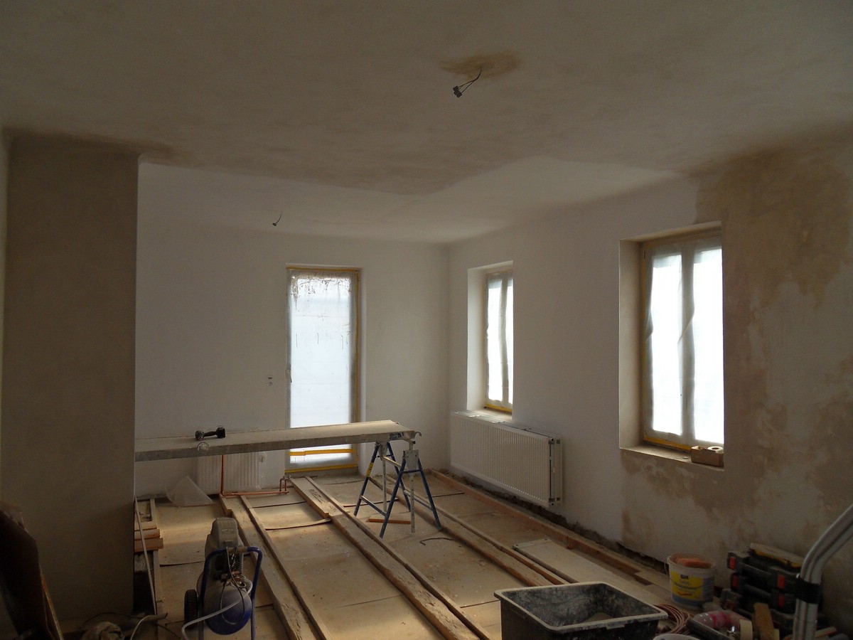 Ramon hat das Bad weiter vom Putz befreit, Ich hab mich wieder Kalkfarbe gewidmet und die Stube weiter gekalkt. Auch unser Maurer war nicht untätig. Im Flur ist der erste frische Putz dran.