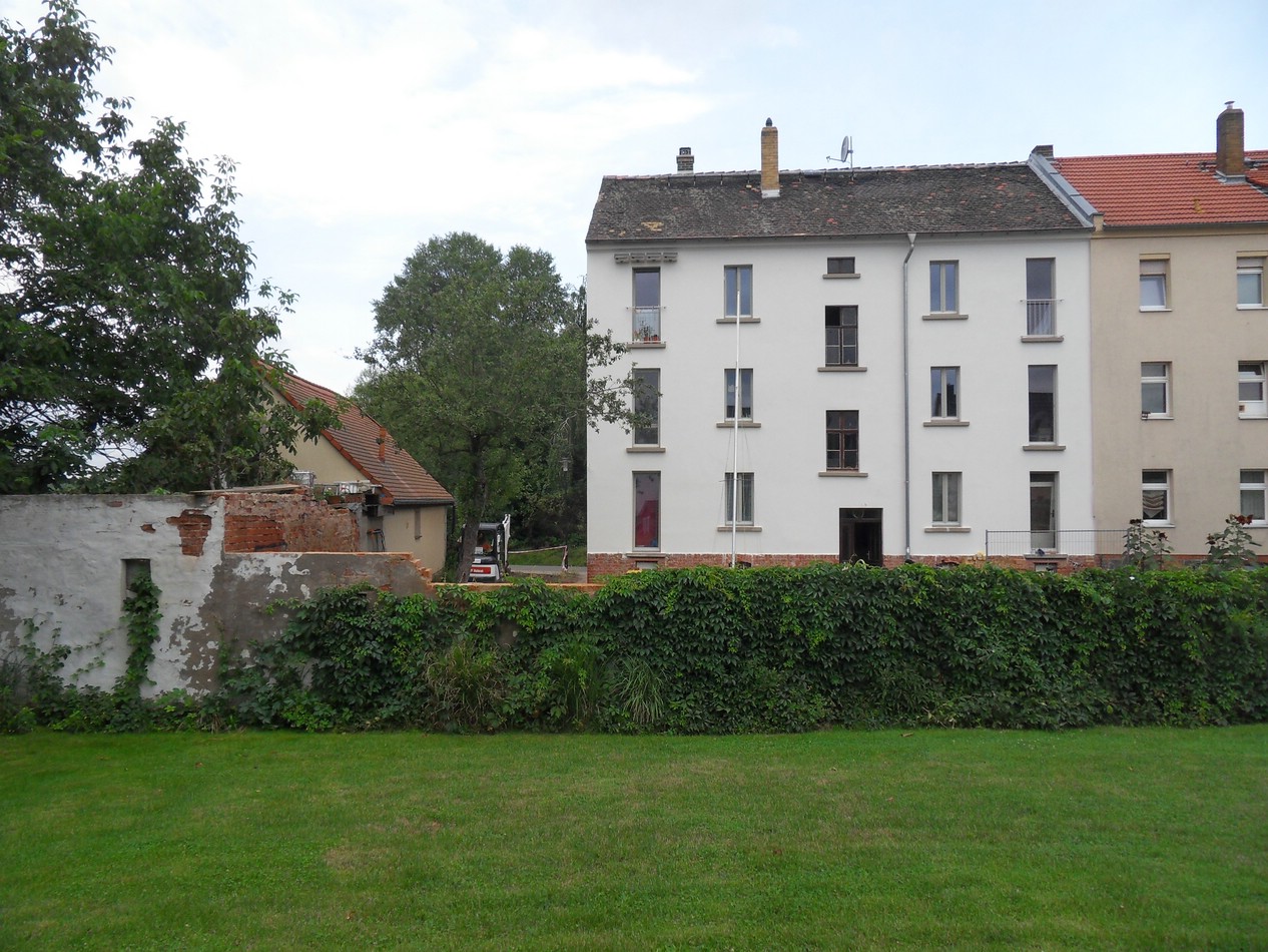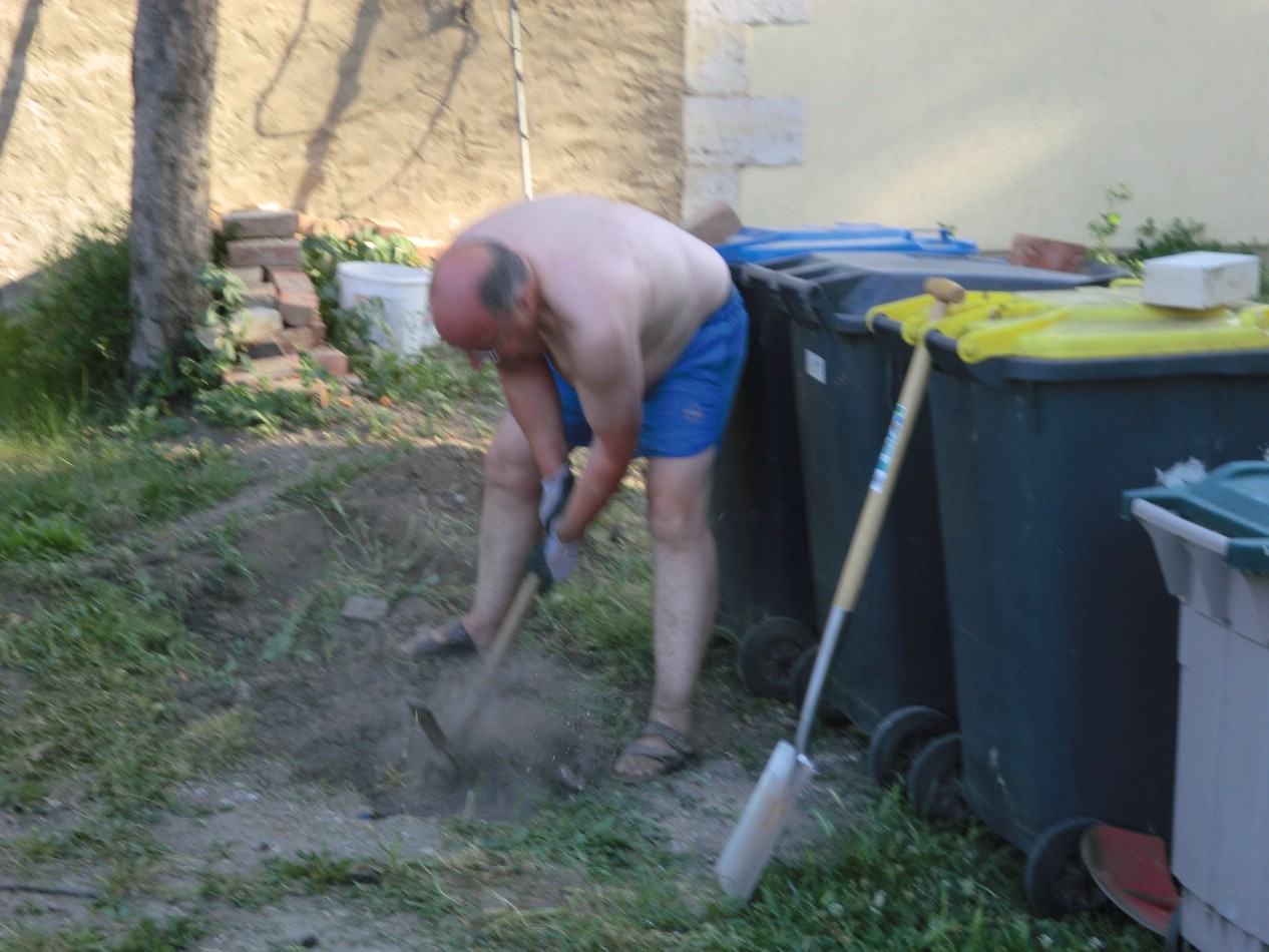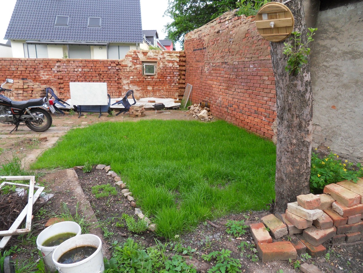 Beim ehemaligen Waschhaus noch mal eine Palette Ziegel ausgebuddelt, das Loch verfüllt und Rasen gesät.